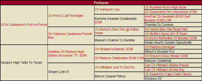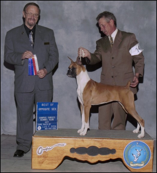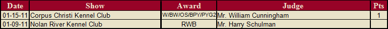 Pfour took her first points from the 6-9 month puppy class at the Corpus Christi Kennel Club show on January 15, 2011. She was awarded Winners, Best Of Winners, Best Of Opposite to her sire, Best Puppy and a Puppy Group 2 under Judge William Cunningham. Pfour is expertly presented by agents Ike Liotto and Tina Starr.